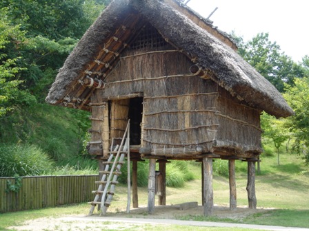 また、麓には古墳館の近くに、【科野のムラ】も復元されていて、茅葺きの家や田んぼや畑などもあった。ちなみに右の写真は高床式の倉庫?ですよ。学校で教わってる筈…。このムラは長野県立歴史観の地下から発見されたもので、家や物置小屋や儀式の場などが復元されてました。この歴史館の方へは行ってないのだけど、同じ古墳時代のものとのこと。ここのムラの人たちは古墳の主が治めていたものの一つだったのだとうかがえる。