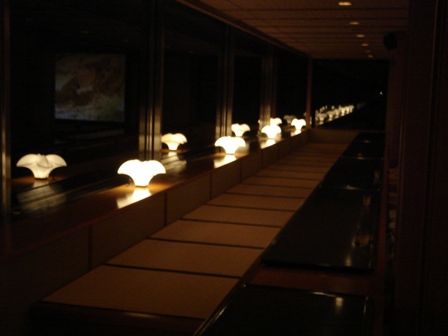 この写真は入ってまずあるロビーの夜の写真なのだけど、この左側にある窓が全部奥の方へ移動するようになっていて、行ったときは冷房の関係かこの閉まってる状態だったものの、朝方涼しい頃は全開になってました。川を挟んだ谷に沿って建っているこの旅館は、どの部屋からも川の反対に位置する緑が見え、温泉からも堪能できる。料理はもう最高でした♪やはりここ美味しいわ。3年ぶりの旅館、堪能させていただきました。